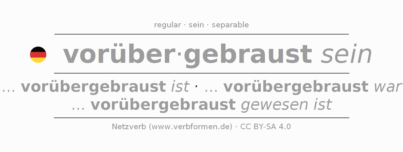 Tablas de verbos para la conjugación de vorüber·gebraust sein en línea, representadas de forma simple, con todas las construcciones verbales en singular y plural, en todas las personas gramaticales (1ª persona, 2ª persona, 3ª persona). El practicar la conjugación del verbo vorüber·gebraust sein es útil para tareas, exámenes, la escuela, la universidad, las clases de alemán y para los estudiantes adultos. Especialmente para los estudiantes del alemán es muy importante el conjugar los verbos y el formar las raíces verbales de forma correcta. Aquí encuentras más información acerca del tema Wiktionary vorüberbrausen und unter vorüberbrausen im Duden.