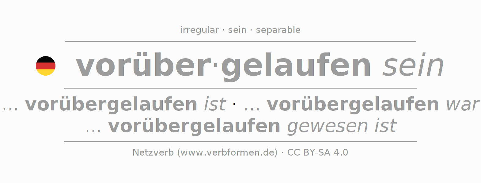 Tablas de verbos para la conjugación de vorüber·gelaufen sein en línea, representadas de forma simple, con todas las construcciones verbales en singular y plural, en todas las personas gramaticales (1ª persona, 2ª persona, 3ª persona). El practicar la conjugación del verbo vorüber·gelaufen sein es útil para tareas, exámenes, la escuela, la universidad, las clases de alemán y para los estudiantes adultos. Especialmente para los estudiantes del alemán es muy importante el conjugar los verbos y el formar las raíces verbales de forma correcta. Aquí encuentras más información acerca del tema Wiktionary vorüberlaufen und unter vorüberlaufen im Duden.