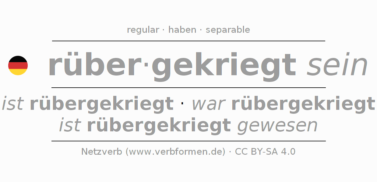 - Pasado perfecto: ich bin rübergekriegt gewesen, du bist rübergekriegt gewesen, er ist rübergekriegt gewesen, wir sind rübergekriegt gewesen, ihr seid rübergekriegt gewesen, sie sind rübergekriegt gewesen