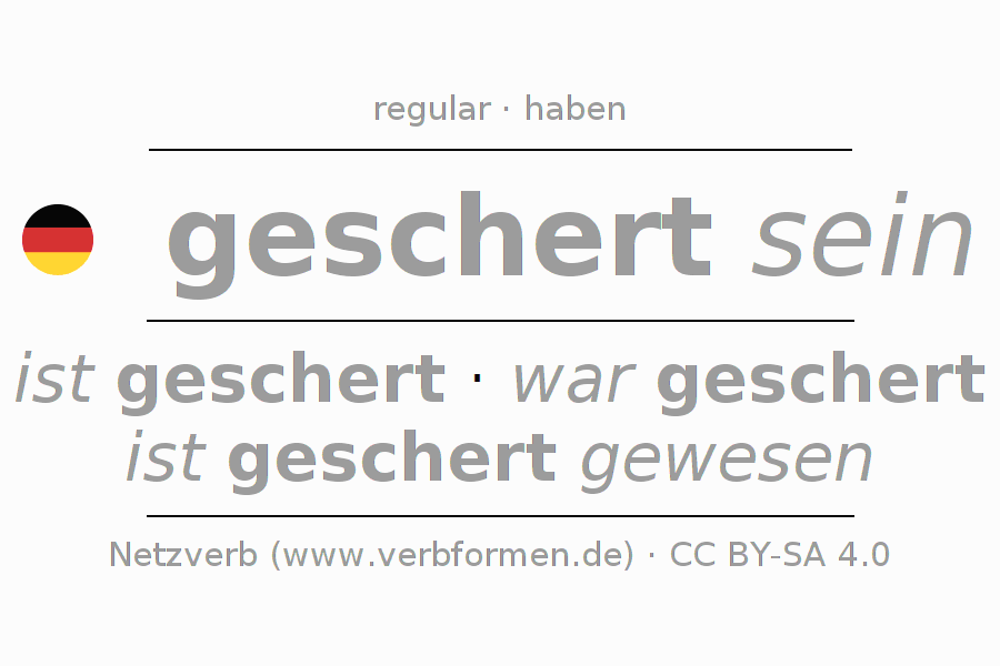 Tablas de verbos para la conjugación de geschert sein en línea, representadas de forma simple, con todas las construcciones verbales en singular y plural, en todas las personas gramaticales (1ª persona, 2ª persona, 3ª persona). El practicar la conjugación del verbo geschert sein es útil para tareas, exámenes, la escuela, la universidad, las clases de alemán y para los estudiantes adultos. Especialmente para los estudiantes del alemán es muy importante el conjugar los verbos y el formar las raíces verbales de forma correcta. Aquí encuentras más información acerca del tema Wiktionary scheren und unter scheren im Duden.
