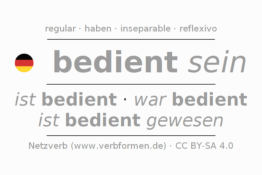 - Pasado perfecto: ich bin bedient gewesen, du bist bedient gewesen, er ist bedient gewesen, wir sind bedient gewesen, ihr seid bedient gewesen, sie sind bedient gewesen
