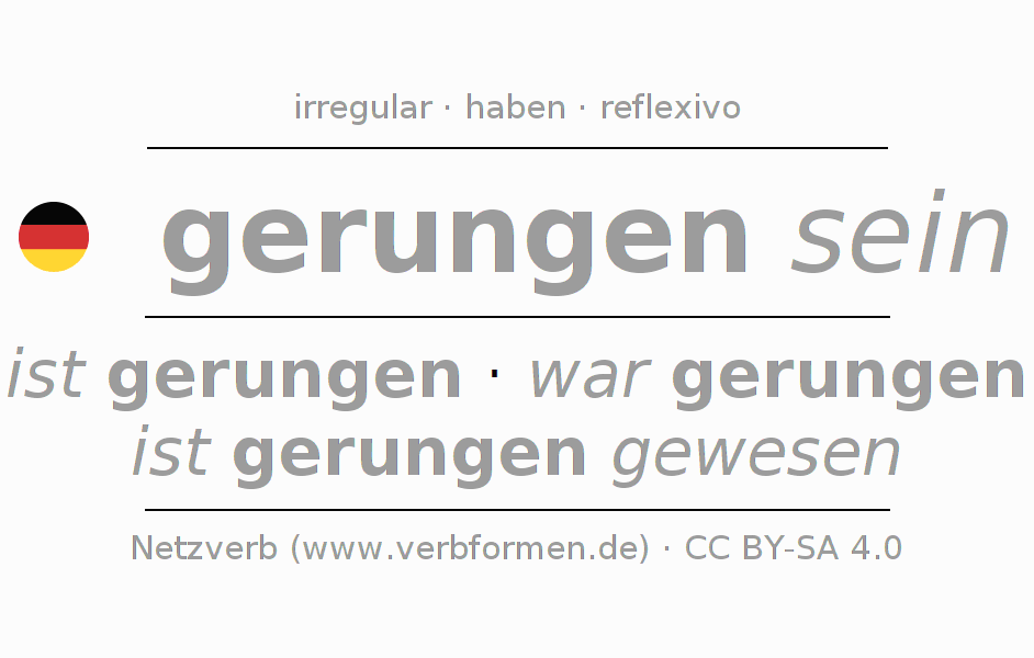 Tablas de verbos para la conjugación de gerungen sein en línea, representadas de forma simple, con todas las construcciones verbales en singular y plural, en todas las personas gramaticales (1ª persona, 2ª persona, 3ª persona). El practicar la conjugación del verbo gerungen sein es útil para tareas, exámenes, la escuela, la universidad, las clases de alemán y para los estudiantes adultos. Especialmente para los estudiantes del alemán es muy importante el conjugar los verbos y el formar las raíces verbales de forma correcta. Aquí encuentras más información acerca del tema Wiktionary ringen und unter ringen im Duden.