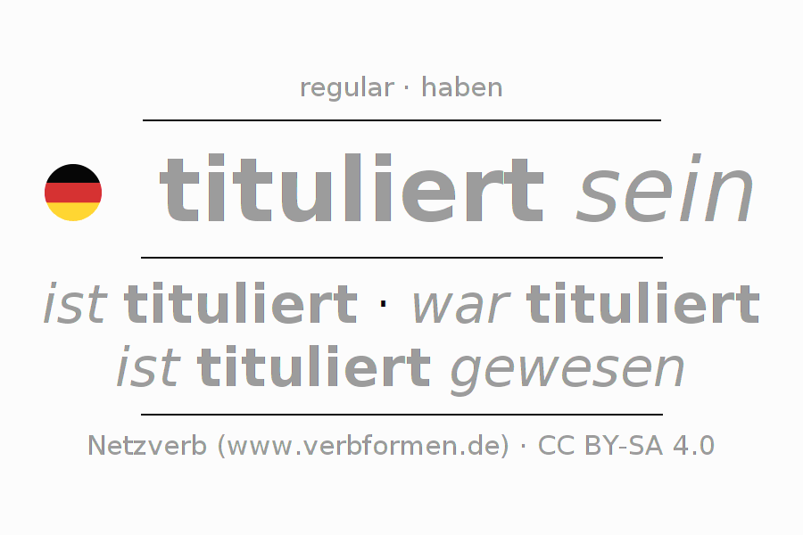 Tablas de verbos para la conjugación de tituliert sein en línea, representadas de forma simple, con todas las construcciones verbales en singular y plural, en todas las personas gramaticales (1ª persona, 2ª persona, 3ª persona). El practicar la conjugación del verbo tituliert sein es útil para tareas, exámenes, la escuela, la universidad, las clases de alemán y para los estudiantes adultos. Especialmente para los estudiantes del alemán es muy importante el conjugar los verbos y el formar las raíces verbales de forma correcta. Aquí encuentras más información acerca del tema Wiktionary titulieren und unter titulieren im Duden.
