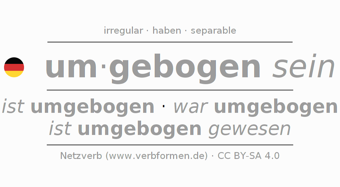 Tablas de verbos para la conjugación de um·gebogen sein en línea, representadas de forma simple, con todas las construcciones verbales en singular y plural, en todas las personas gramaticales (1ª persona, 2ª persona, 3ª persona). El practicar la conjugación del verbo um·gebogen sein es útil para tareas, exámenes, la escuela, la universidad, las clases de alemán y para los estudiantes adultos. Especialmente para los estudiantes del alemán es muy importante el conjugar los verbos y el formar las raíces verbales de forma correcta. Aquí encuentras más información acerca del tema Wiktionary umbiegen und unter umbiegen im Duden.