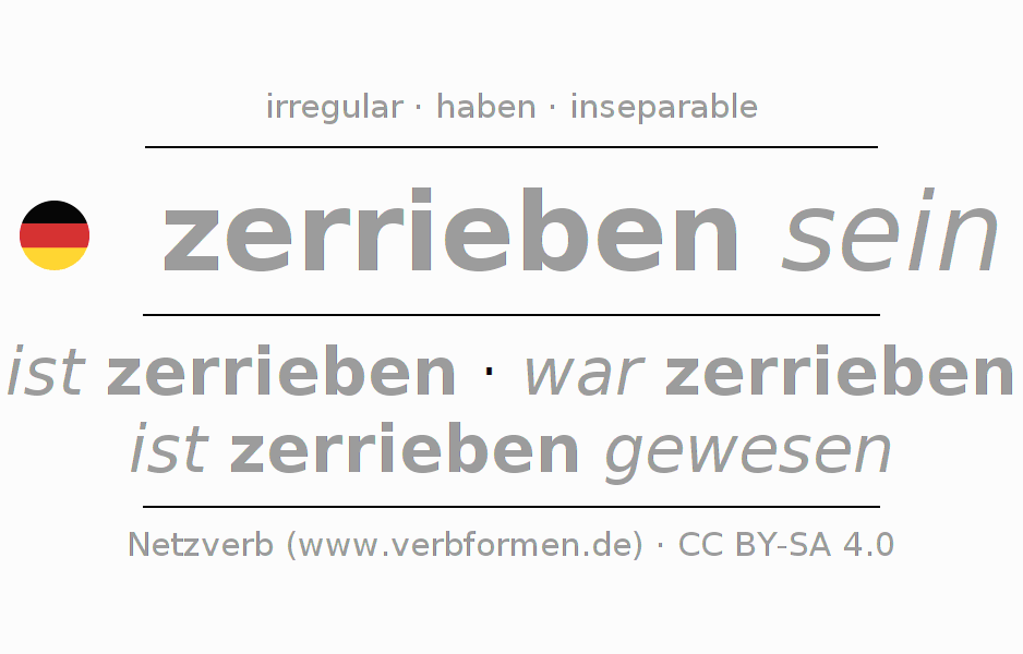 Tablas de verbos para la conjugación de zerrieben sein en línea, representadas de forma simple, con todas las construcciones verbales en singular y plural, en todas las personas gramaticales (1ª persona, 2ª persona, 3ª persona). El practicar la conjugación del verbo zerrieben sein es útil para tareas, exámenes, la escuela, la universidad, las clases de alemán y para los estudiantes adultos. Especialmente para los estudiantes del alemán es muy importante el conjugar los verbos y el formar las raíces verbales de forma correcta. Aquí encuentras más información acerca del tema Wiktionary zerreiben und unter zerreiben im Duden.