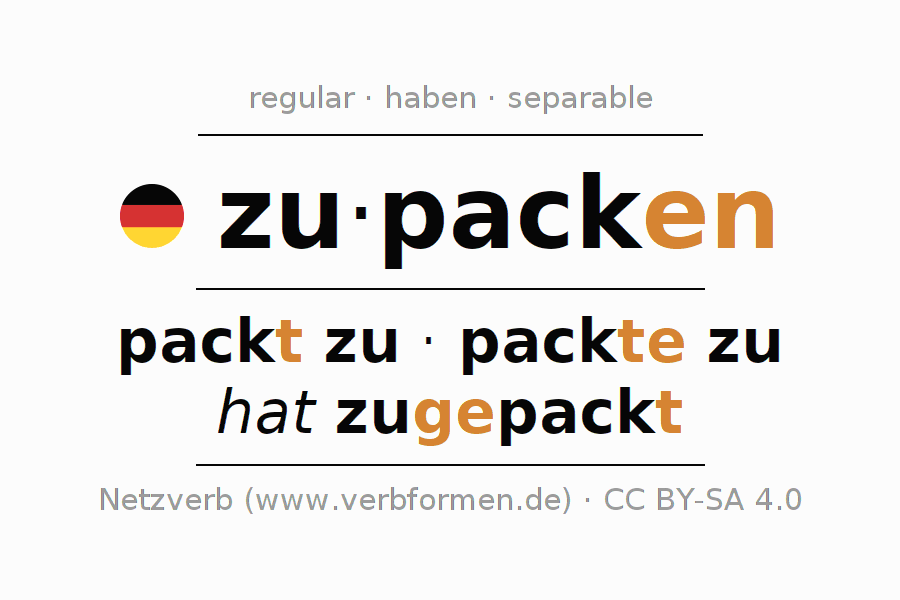 - Presente: pack(e) (du) zu, packen wir zu, packt (ihr) zu, packen Sie zu