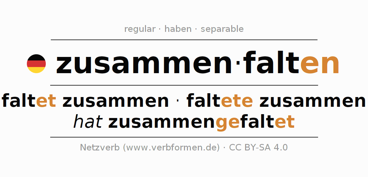 - Presente: ich falt(e) zusammen, du faltest zusammen, er faltet zusammen, wir falten zusammen, ihr faltet zusammen, sie falten zusammen