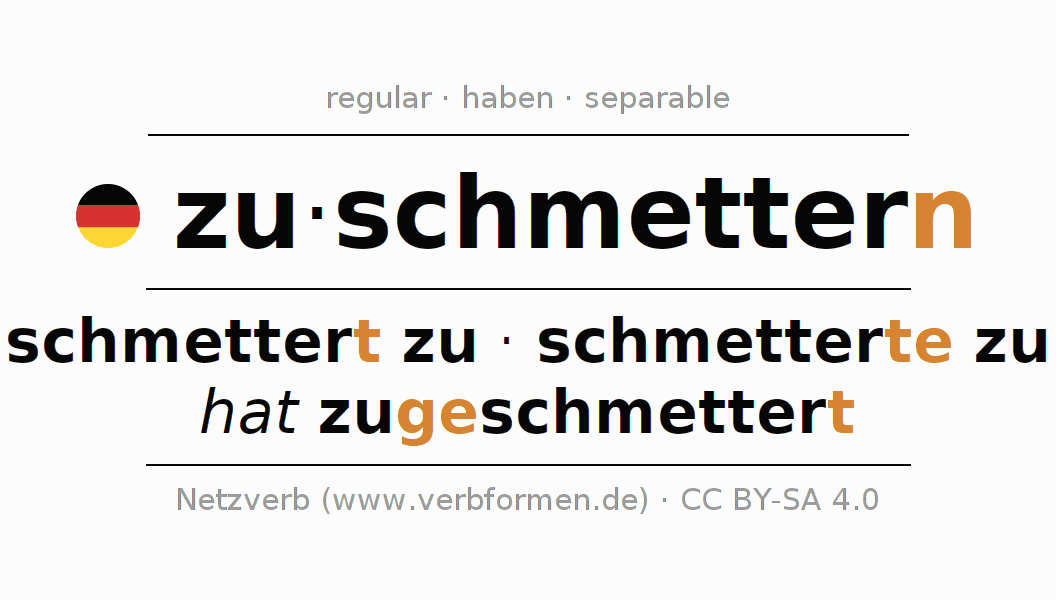 - Pasado perfecto: ich habe zugeschmettert, du hast zugeschmettert, er hat zugeschmettert, wir haben zugeschmettert, ihr habt zugeschmettert, sie haben zugeschmettert