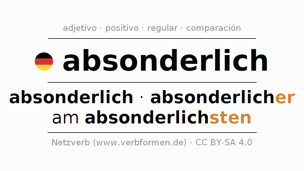 El comparativo en forma de tabla con todas sus formas de declinación: fuerte, débil y mixta. Estas están representadas de forma clara en una tabla sinópica en singular, plural y en los cuatro casos gramaticales: nominativo (primer caso), genitivo (segundo caso), dativo (tercer caso) y acusativo (cuarto caso). Aquí encontraras más información acerca del tema Wiktionary absonderlich y aquí también a través del Duden absonderlich.