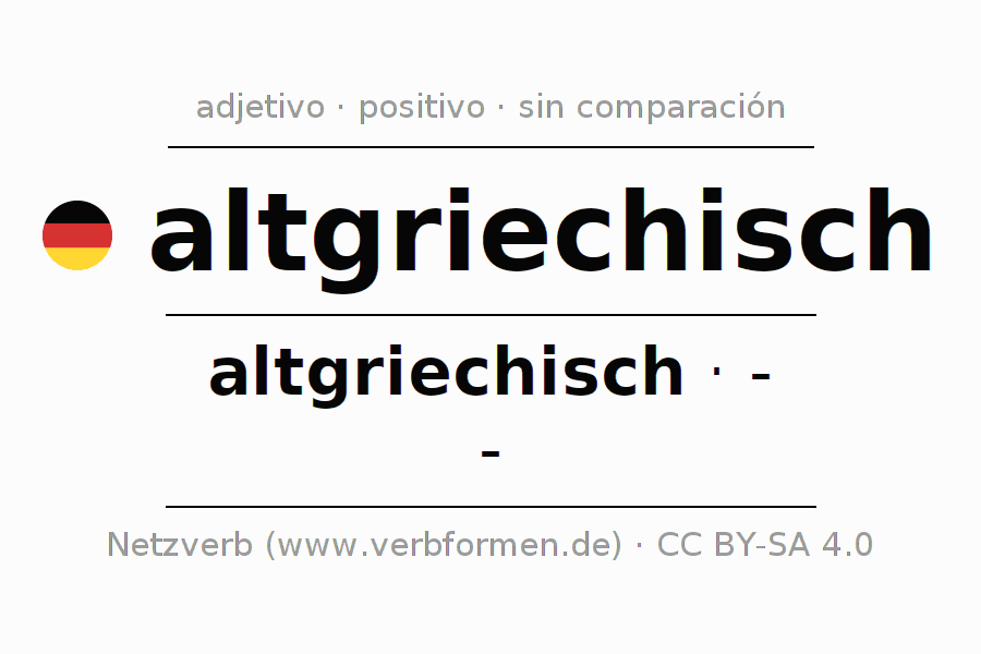 El adjetivo altgriechisch se declina (griego antiguo, griego clásico) utilizando la construcción altgriechisch, la cual no puede ser exaltada, es decir este adjetivo no permite formas del comparativo o superlativo. El adjetivo altgriechisch puede ser utilizado de forma atributiva en frente de un sustantivo así como de forma predicativa en conjunto con un verbo.Aquí puedes declinar y comparar no solamente altgriechisch sino también todos los adjetivos alemanes. Comentarios ☆