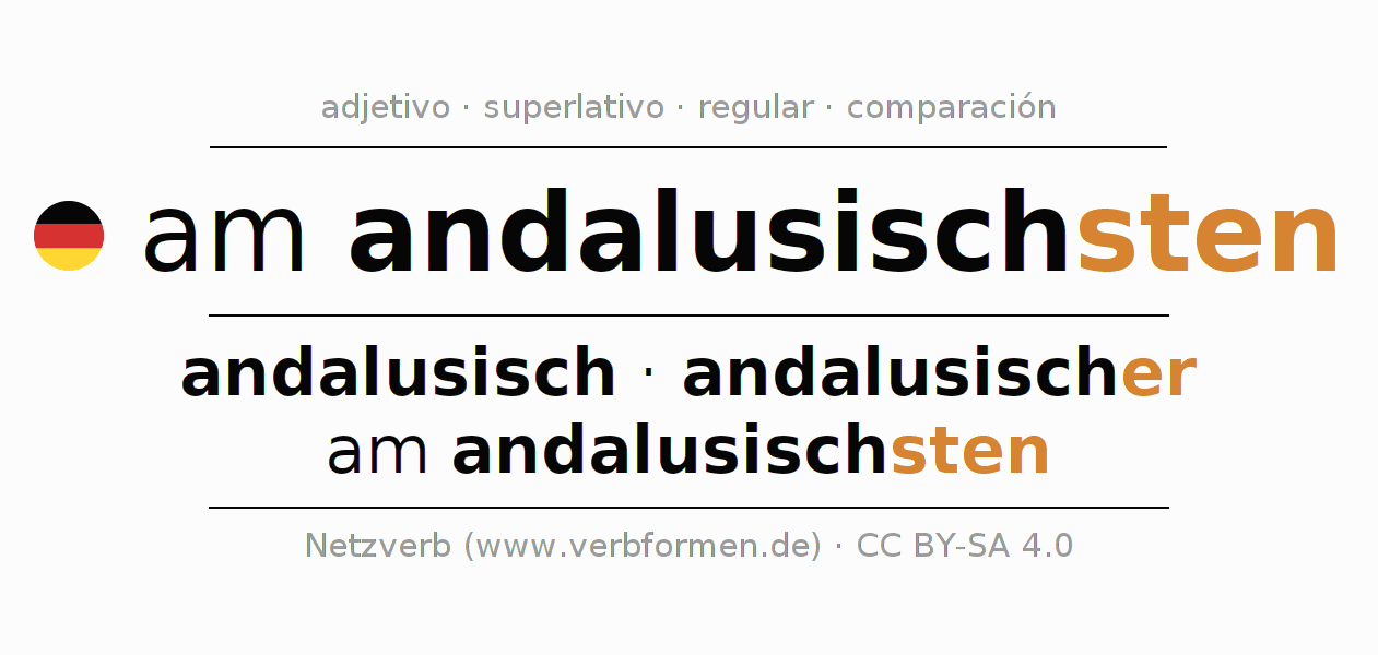 El comparativo en forma de tabla con todas sus formas de declinación: fuerte, débil y mixta. Estas están representadas de forma clara en una tabla sinópica en singular, plural y en los cuatro casos gramaticales: nominativo (primer caso), genitivo (segundo caso), dativo (tercer caso) y acusativo (cuarto caso). Aquí encontraras más información acerca del tema Wiktionary am andalusischsten y aquí también a través del Duden am andalusischsten.