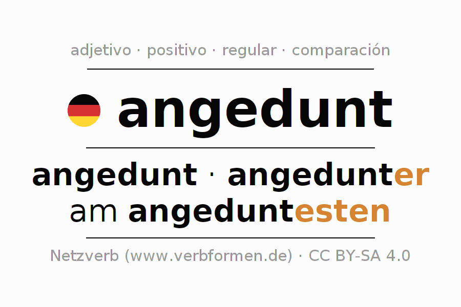 El adjetivo angedunt se declina (abotargado, hinchado) utilizando las construcciones de comparación. Las terminaciones necesarias para la exaltación, comparación y el superlativo son er/esten. El adjetivo angedunt puede ser utilizado de forma atributiva en frente de un sustantivo así como de forma predicativa en conjunto con un verbo.Aquí puedes declinar y comparar no solamente angedunt sino también todos los adjetivos alemanes. Comentarios ☆