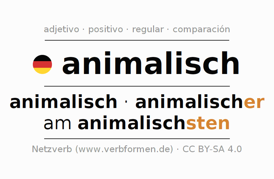El comparativo en forma de tabla con todas sus formas de declinación: fuerte, débil y mixta. Estas están representadas de forma clara en una tabla sinópica en singular, plural y en los cuatro casos gramaticales: nominativo (primer caso), genitivo (segundo caso), dativo (tercer caso) y acusativo (cuarto caso). Aquí encontraras más información acerca del tema Wiktionary animalisch y aquí también a través del Duden animalisch.