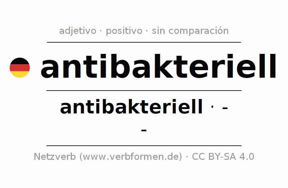 El adjetivo antibakteriell se declina (antibacteriano) utilizando la construcción antibakteriell, la cual no puede ser exaltada, es decir este adjetivo no permite formas del comparativo o superlativo. El adjetivo antibakteriell puede ser utilizado de forma atributiva en frente de un sustantivo así como de forma predicativa en conjunto con un verbo.Aquí puedes declinar y comparar no solamente antibakteriell sino también todos los adjetivos alemanes. Comentarios ☆
