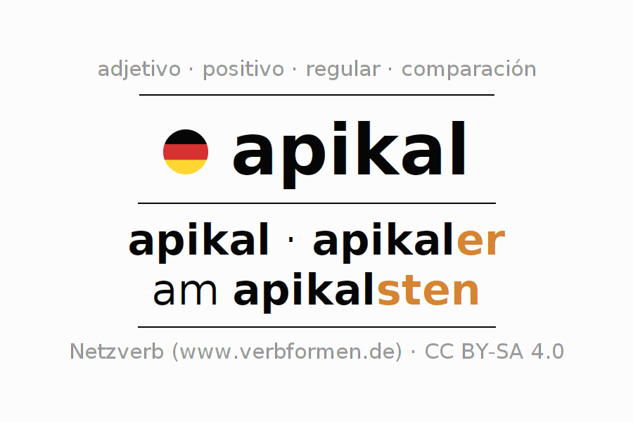 El adjetivo apikal se declina (apical) utilizando las construcciones de comparación. Las terminaciones necesarias para la exaltación, comparación y el superlativo son er/sten. El adjetivo apikal puede ser utilizado de forma atributiva en frente de un sustantivo así como de forma predicativa en conjunto con un verbo.Aquí puedes declinar y comparar no solamente apikal sino también todos los adjetivos alemanes. Comentarios ☆