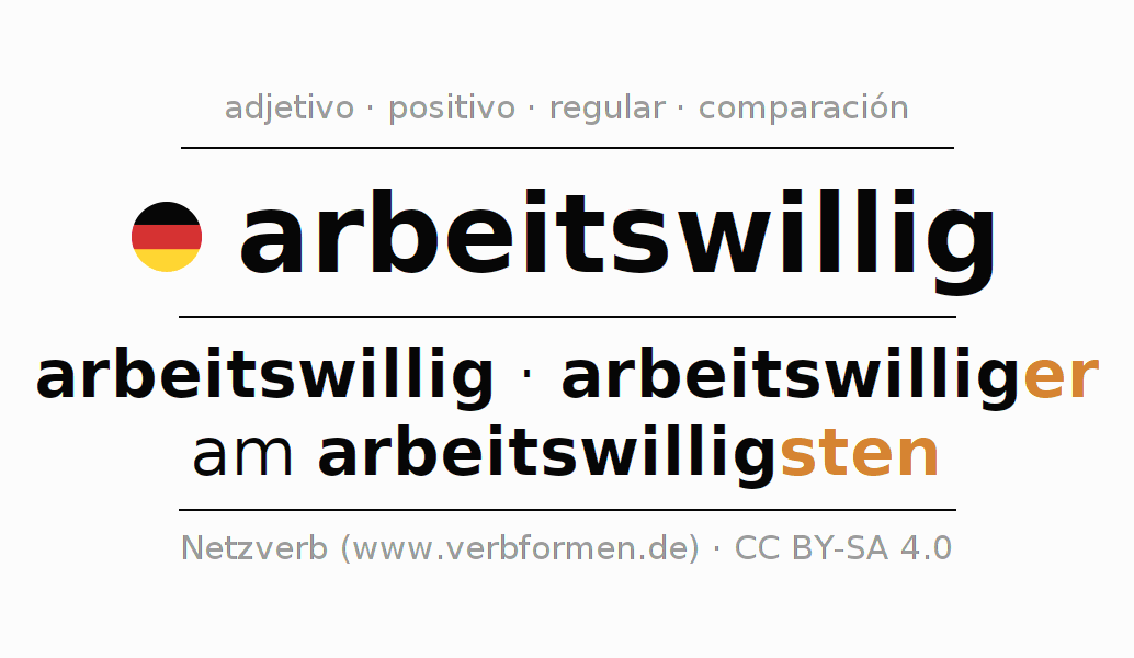 El comparativo en forma de tabla con todas sus formas de declinación: fuerte, débil y mixta. Estas están representadas de forma clara en una tabla sinópica en singular, plural y en los cuatro casos gramaticales: nominativo (primer caso), genitivo (segundo caso), dativo (tercer caso) y acusativo (cuarto caso). Aquí encontraras más información acerca del tema Wiktionary arbeitswillig y aquí también a través del Duden arbeitswillig.