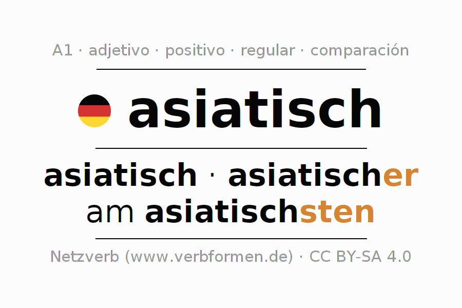 El adjetivo asiatisch se declina (asiático, asiática) utilizando las construcciones de comparación. Las terminaciones necesarias para la exaltación, comparación y el superlativo son er/sten. El adjetivo asiatisch puede ser utilizado de forma atributiva en frente de un sustantivo así como de forma predicativa en conjunto con un verbo.Aquí puedes declinar y comparar no solamente asiatisch sino también todos los adjetivos alemanes. Comentarios ☆