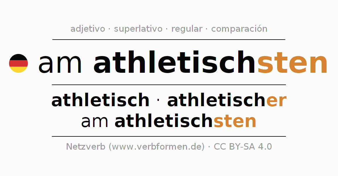 El comparativo en forma de tabla con todas sus formas de declinación: fuerte, débil y mixta. Estas están representadas de forma clara en una tabla sinópica en singular, plural y en los cuatro casos gramaticales: nominativo (primer caso), genitivo (segundo caso), dativo (tercer caso) y acusativo (cuarto caso). Aquí encontraras más información acerca del tema Wiktionary am athletischsten y aquí también a través del Duden am athletischsten.