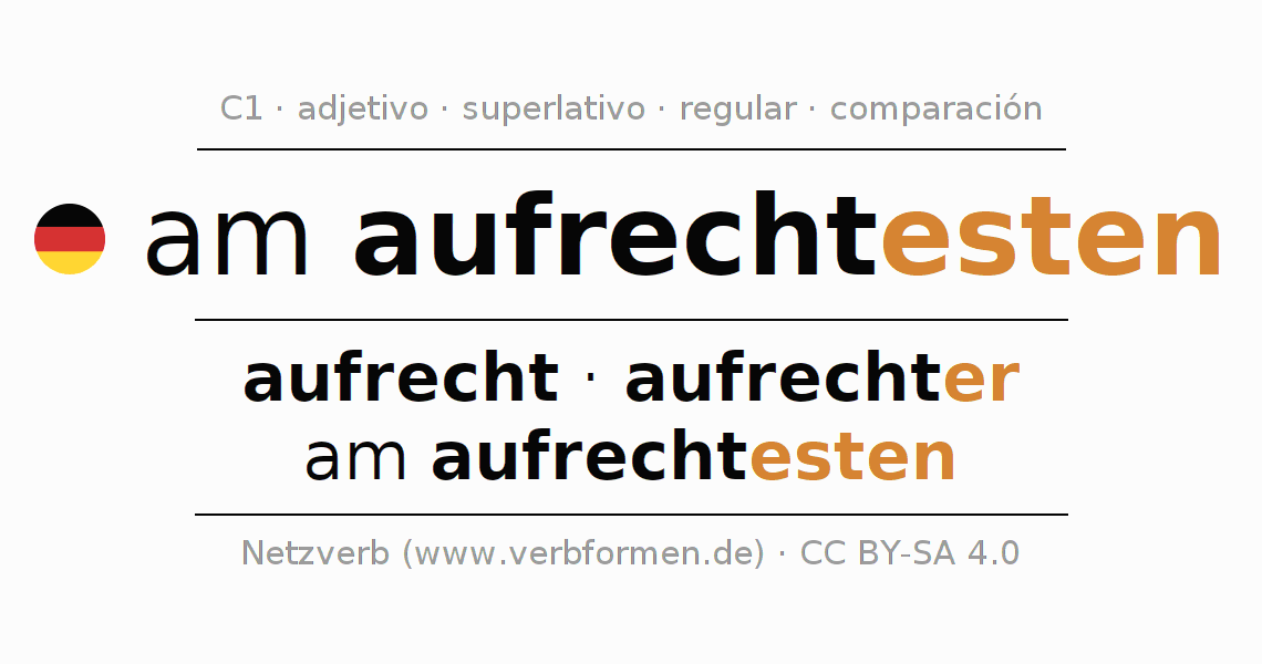 El comparativo en forma de tabla con todas sus formas de declinación: fuerte, débil y mixta. Estas están representadas de forma clara en una tabla sinópica en singular, plural y en los cuatro casos gramaticales: nominativo (primer caso), genitivo (segundo caso), dativo (tercer caso) y acusativo (cuarto caso). Aquí encontraras más información acerca del tema Wiktionary am aufrechtesten y aquí también a través del Duden am aufrechtesten.