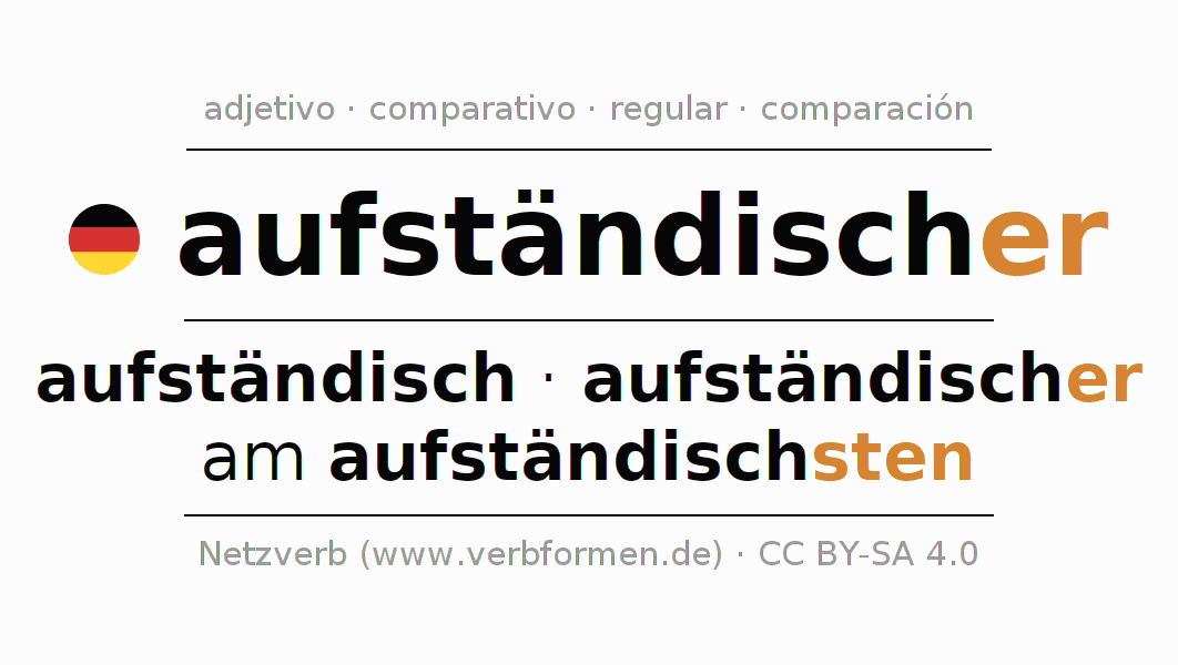 El comparativo en forma de tabla con todas sus formas de declinación: fuerte, débil y mixta. Estas están representadas de forma clara en una tabla sinópica en singular, plural y en los cuatro casos gramaticales: nominativo (primer caso), genitivo (segundo caso), dativo (tercer caso) y acusativo (cuarto caso). Aquí encontraras más información acerca del tema Wiktionary aufständischer y aquí también a través del Duden aufständischer.