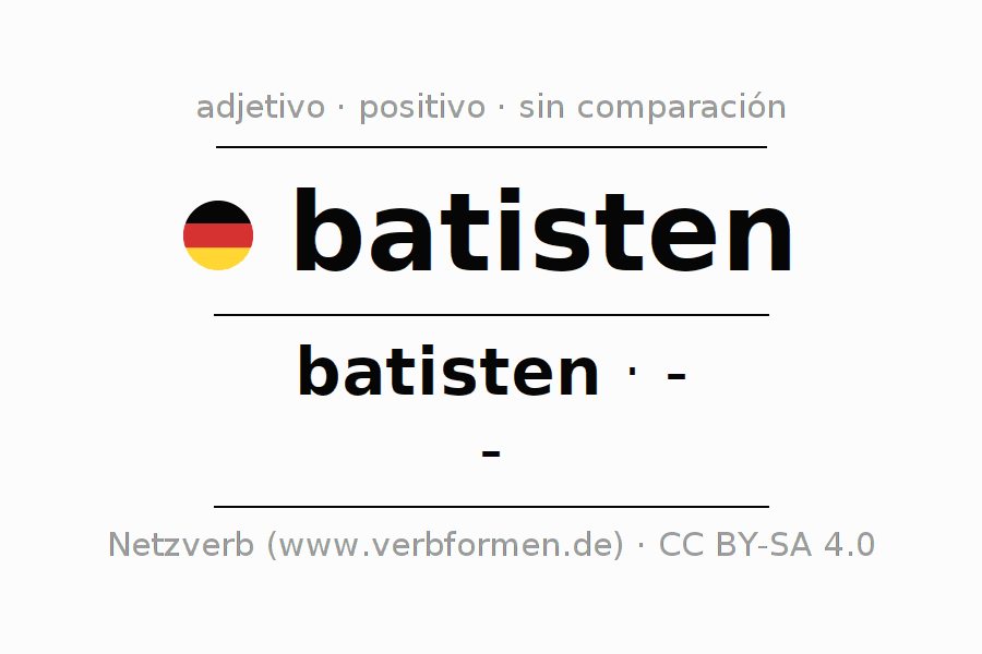 El adjetivo batisten se declina (batista) utilizando la construcción batisten, la cual no puede ser exaltada, es decir este adjetivo no permite formas del comparativo o superlativo. El adjetivo batisten puede ser utilizado de forma atributiva en frente de un sustantivo así como de forma predicativa en conjunto con un verbo.Aquí puedes declinar y comparar no solamente batisten sino también todos los adjetivos alemanes. Comentarios ☆