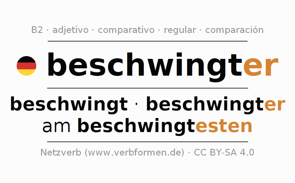 El comparativo en forma de tabla con todas sus formas de declinación: fuerte, débil y mixta. Estas están representadas de forma clara en una tabla sinópica en singular, plural y en los cuatro casos gramaticales: nominativo (primer caso), genitivo (segundo caso), dativo (tercer caso) y acusativo (cuarto caso). Aquí encontraras más información acerca del tema Wiktionary beschwingter y aquí también a través del Duden beschwingter.