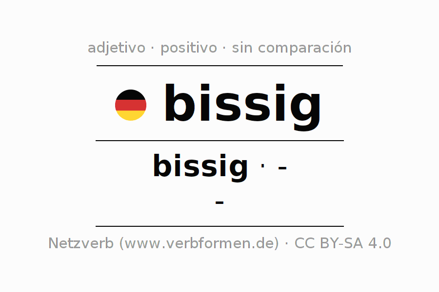 El comparativo en forma de tabla con todas sus formas de declinación: fuerte, débil y mixta. Estas están representadas de forma clara en una tabla sinópica en singular, plural y en los cuatro casos gramaticales: nominativo (primer caso), genitivo (segundo caso), dativo (tercer caso) y acusativo (cuarto caso). Aquí encontraras más información acerca del tema Wiktionary bissig y aquí también a través del Duden bissig.