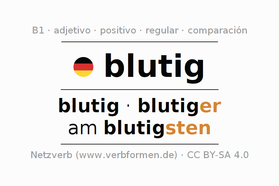 El comparativo en forma de tabla con todas sus formas de declinación: fuerte, débil y mixta. Estas están representadas de forma clara en una tabla sinópica en singular, plural y en los cuatro casos gramaticales: nominativo (primer caso), genitivo (segundo caso), dativo (tercer caso) y acusativo (cuarto caso). Aquí encontraras más información acerca del tema Wiktionary blutig y aquí también a través del Duden blutig.