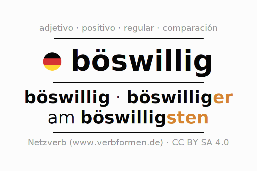 El comparativo en forma de tabla con todas sus formas de declinación: fuerte, débil y mixta. Estas están representadas de forma clara en una tabla sinópica en singular, plural y en los cuatro casos gramaticales: nominativo (primer caso), genitivo (segundo caso), dativo (tercer caso) y acusativo (cuarto caso). Aquí encontraras más información acerca del tema Wiktionary böswillig y aquí también a través del Duden böswillig.