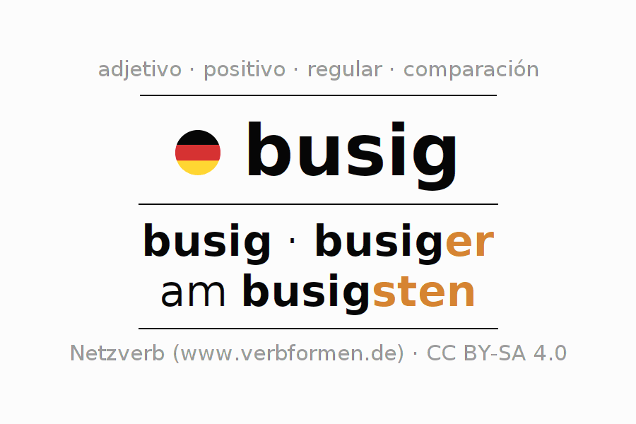 El comparativo en forma de tabla con todas sus formas de declinación: fuerte, débil y mixta. Estas están representadas de forma clara en una tabla sinópica en singular, plural y en los cuatro casos gramaticales: nominativo (primer caso), genitivo (segundo caso), dativo (tercer caso) y acusativo (cuarto caso). Aquí encontraras más información acerca del tema Wiktionary busig y aquí también a través del Duden busig.
