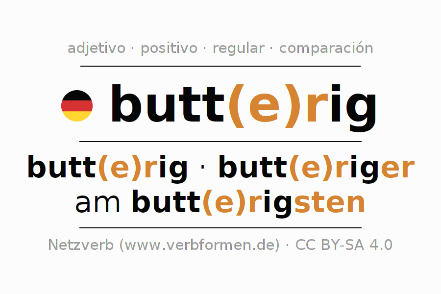 El comparativo en forma de tabla con todas sus formas de declinación: fuerte, débil y mixta. Estas están representadas de forma clara en una tabla sinópica en singular, plural y en los cuatro casos gramaticales: nominativo (primer caso), genitivo (segundo caso), dativo (tercer caso) y acusativo (cuarto caso). Aquí encontraras más información acerca del tema Wiktionary butterig y aquí también a través del Duden butterig.