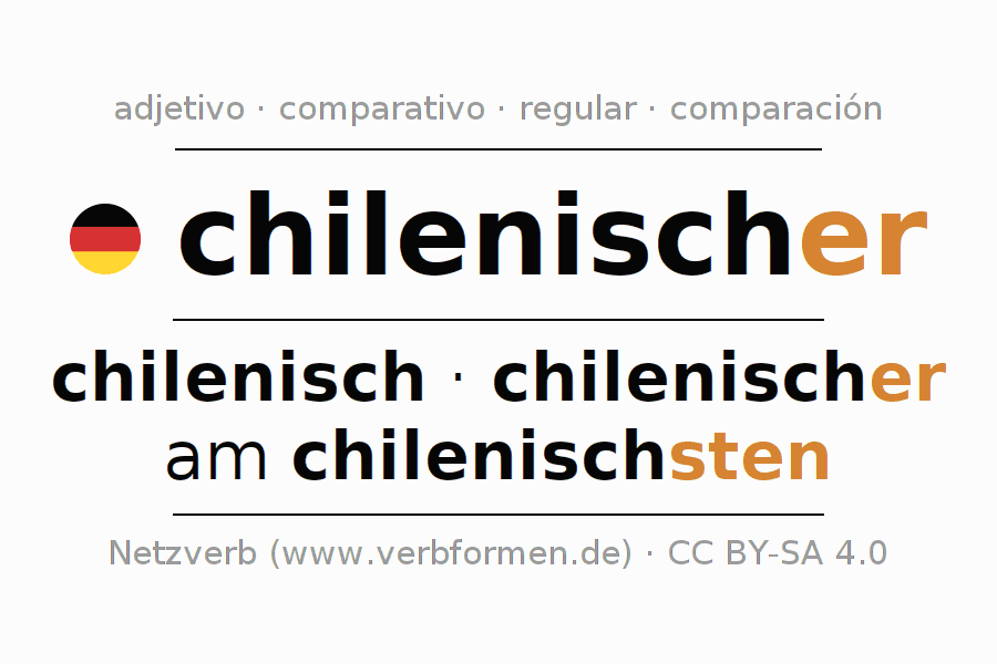 El comparativo en forma de tabla con todas sus formas de declinación: fuerte, débil y mixta. Estas están representadas de forma clara en una tabla sinópica en singular, plural y en los cuatro casos gramaticales: nominativo (primer caso), genitivo (segundo caso), dativo (tercer caso) y acusativo (cuarto caso). Aquí encontraras más información acerca del tema Wiktionary chilenischer y aquí también a través del Duden chilenischer.