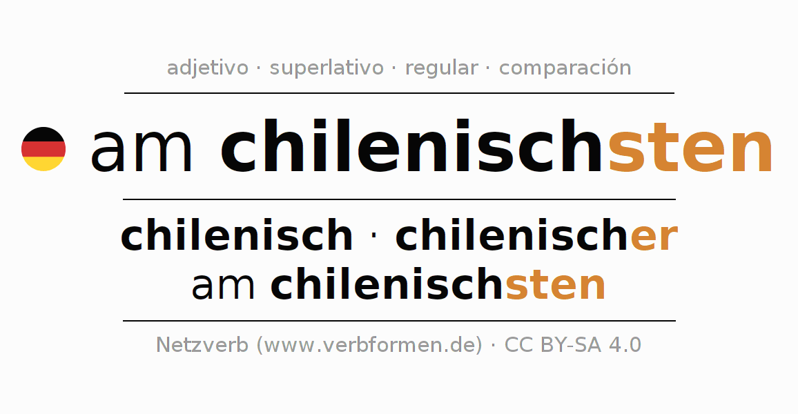 El comparativo en forma de tabla con todas sus formas de declinación: fuerte, débil y mixta. Estas están representadas de forma clara en una tabla sinópica en singular, plural y en los cuatro casos gramaticales: nominativo (primer caso), genitivo (segundo caso), dativo (tercer caso) y acusativo (cuarto caso). Aquí encontraras más información acerca del tema Wiktionary am chilenischsten y aquí también a través del Duden am chilenischsten.