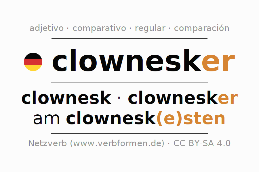 El comparativo en forma de tabla con todas sus formas de declinación: fuerte, débil y mixta. Estas están representadas de forma clara en una tabla sinópica en singular, plural y en los cuatro casos gramaticales: nominativo (primer caso), genitivo (segundo caso), dativo (tercer caso) y acusativo (cuarto caso). Aquí encontraras más información acerca del tema Wiktionary clownesker y aquí también a través del Duden clownesker.