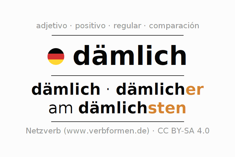 El comparativo en forma de tabla con todas sus formas de declinación: fuerte, débil y mixta. Estas están representadas de forma clara en una tabla sinópica en singular, plural y en los cuatro casos gramaticales: nominativo (primer caso), genitivo (segundo caso), dativo (tercer caso) y acusativo (cuarto caso). Aquí encontraras más información acerca del tema Wiktionary dämlich y aquí también a través del Duden dämlich.
