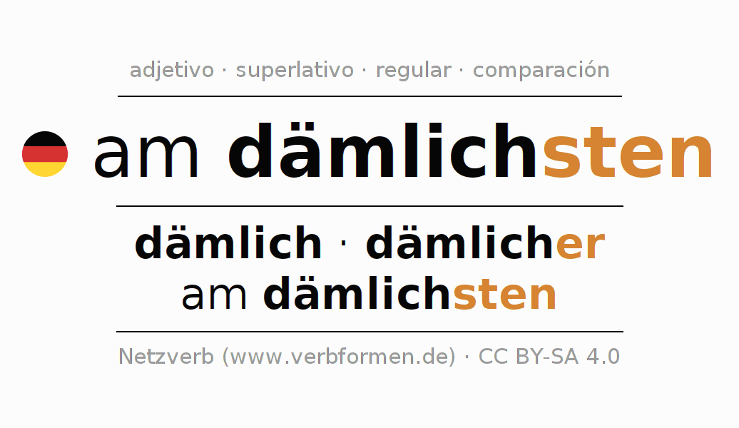 El comparativo en forma de tabla con todas sus formas de declinación: fuerte, débil y mixta. Estas están representadas de forma clara en una tabla sinópica en singular, plural y en los cuatro casos gramaticales: nominativo (primer caso), genitivo (segundo caso), dativo (tercer caso) y acusativo (cuarto caso). Aquí encontraras más información acerca del tema Wiktionary am dämlichsten y aquí también a través del Duden am dämlichsten.