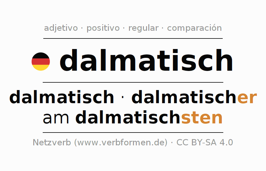 El adjetivo dalmatisch se declina (dálmata) utilizando las construcciones de comparación. Las terminaciones necesarias para la exaltación, comparación y el superlativo son er/sten. El adjetivo dalmatisch puede ser utilizado de forma atributiva en frente de un sustantivo así como de forma predicativa en conjunto con un verbo.Aquí puedes declinar y comparar no solamente dalmatisch sino también todos los adjetivos alemanes. Comentarios ☆