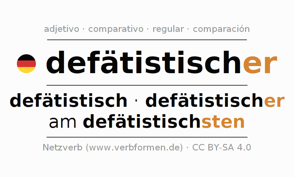 El comparativo en forma de tabla con todas sus formas de declinación: fuerte, débil y mixta. Estas están representadas de forma clara en una tabla sinópica en singular, plural y en los cuatro casos gramaticales: nominativo (primer caso), genitivo (segundo caso), dativo (tercer caso) y acusativo (cuarto caso). Aquí encontraras más información acerca del tema Wiktionary defätistischer y aquí también a través del Duden defätistischer.