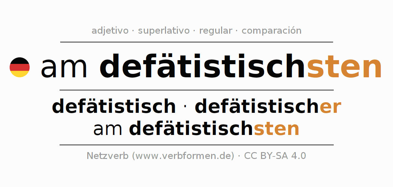 El comparativo en forma de tabla con todas sus formas de declinación: fuerte, débil y mixta. Estas están representadas de forma clara en una tabla sinópica en singular, plural y en los cuatro casos gramaticales: nominativo (primer caso), genitivo (segundo caso), dativo (tercer caso) y acusativo (cuarto caso). Aquí encontraras más información acerca del tema Wiktionary am defätistischsten y aquí también a través del Duden am defätistischsten.