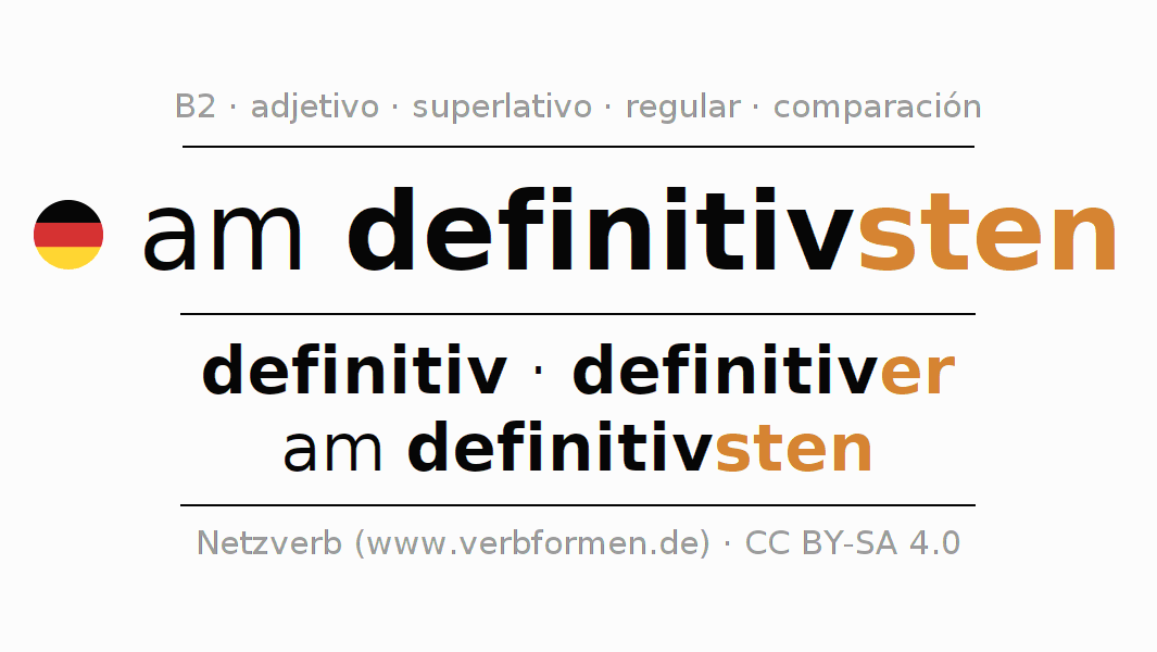 El adjetivo am definitivsten se declina (definitivo) utilizando las construcciones de comparación. Las terminaciones necesarias para la exaltación, comparación y el superlativo son er/sten. El adjetivo am definitivsten puede ser utilizado de forma atributiva en frente de un sustantivo así como de forma predicativa en conjunto con un verbo.Aquí puedes declinar y comparar no solamente am definitivsten sino también todos los adjetivos alemanes. Comentarios ☆