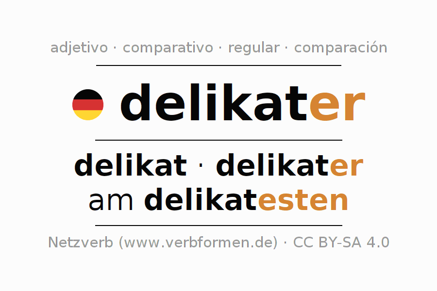 El comparativo en forma de tabla con todas sus formas de declinación: fuerte, débil y mixta. Estas están representadas de forma clara en una tabla sinópica en singular, plural y en los cuatro casos gramaticales: nominativo (primer caso), genitivo (segundo caso), dativo (tercer caso) y acusativo (cuarto caso). Aquí encontraras más información acerca del tema Wiktionary delikater y aquí también a través del Duden delikater.