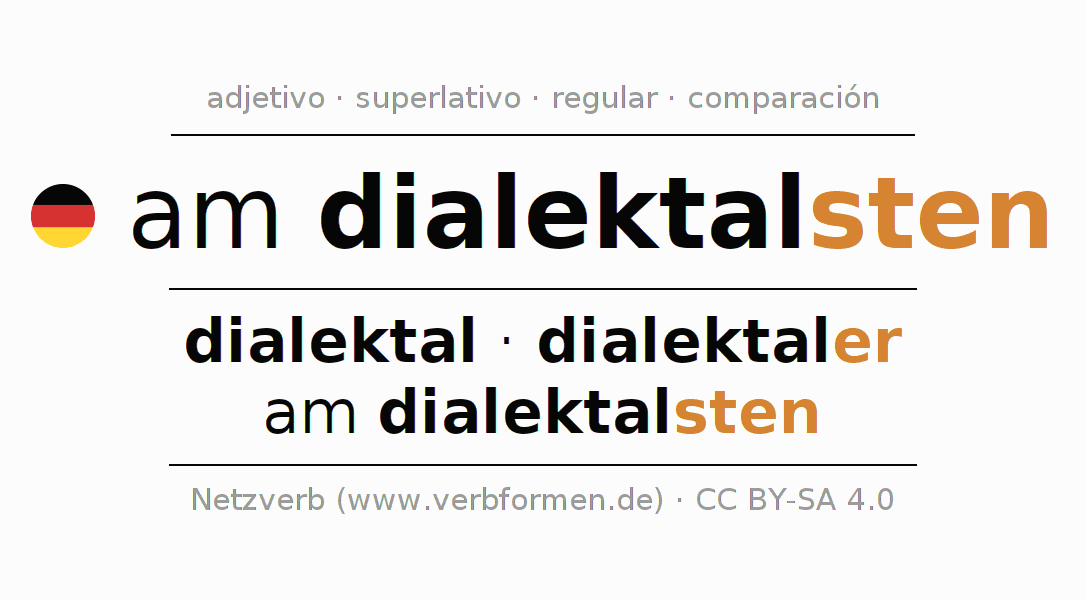 - Masculino: der dialektalste, des dialektalsten, dem dialektalsten, den dialektalsten