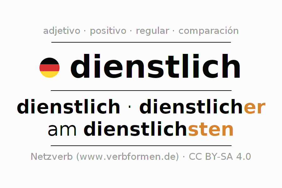 El comparativo en forma de tabla con todas sus formas de declinación: fuerte, débil y mixta. Estas están representadas de forma clara en una tabla sinópica en singular, plural y en los cuatro casos gramaticales: nominativo (primer caso), genitivo (segundo caso), dativo (tercer caso) y acusativo (cuarto caso). Aquí encontraras más información acerca del tema Wiktionary dienstlich y aquí también a través del Duden dienstlich.