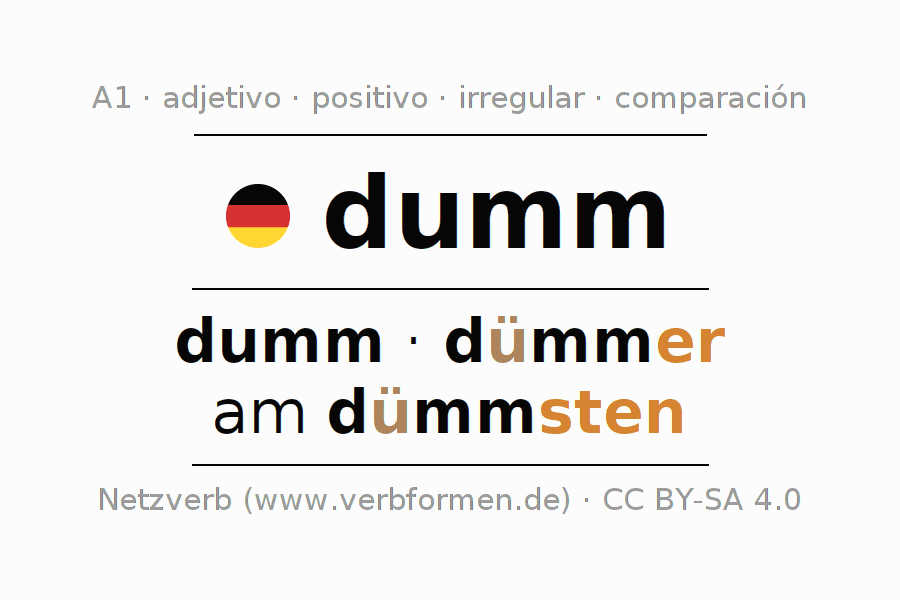 El adjetivo dumm se declina (tonto, estúpido) utilizando las construcciones de comparación. Las terminaciones necesarias para la exaltación, comparación y el superlativo son ü-er/ü-sten. El adjetivo dumm puede ser utilizado de forma atributiva en frente de un sustantivo así como de forma predicativa en conjunto con un verbo.Aquí puedes declinar y comparar no solamente dumm sino también todos los adjetivos alemanes. Comentarios ☆