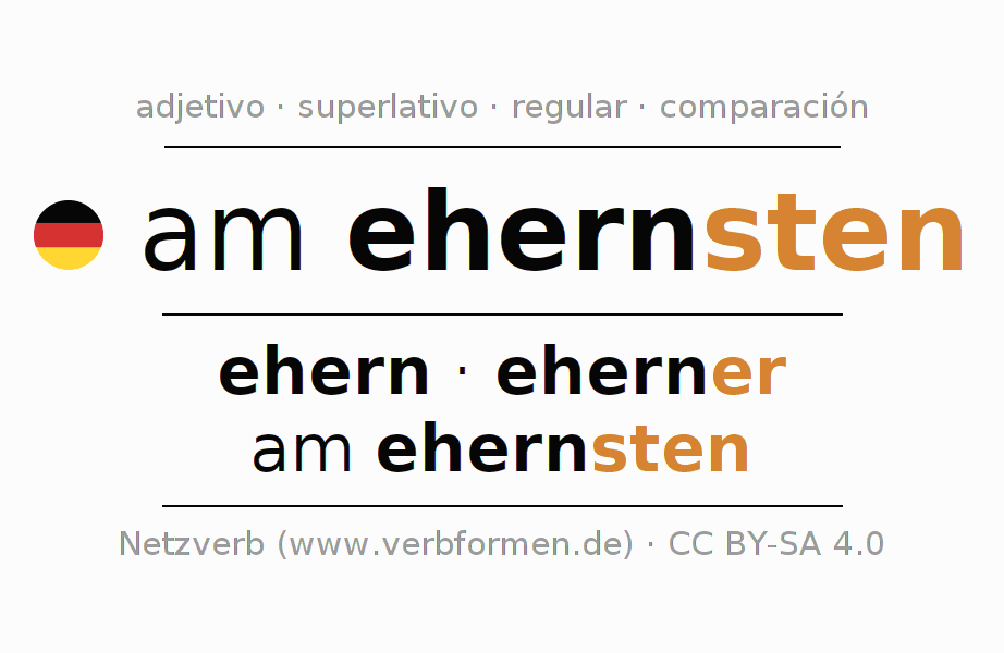 El adjetivo am ehernsten se declina (de bronce, de cobre) utilizando las construcciones de comparación. Las terminaciones necesarias para la exaltación, comparación y el superlativo son er/sten. El adjetivo am ehernsten puede ser utilizado de forma atributiva en frente de un sustantivo así como de forma predicativa en conjunto con un verbo.Aquí puedes declinar y comparar no solamente am ehernsten sino también todos los adjetivos alemanes. Comentarios ☆