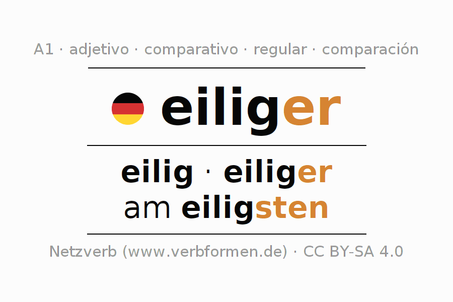 El comparativo en forma de tabla con todas sus formas de declinación: fuerte, débil y mixta. Estas están representadas de forma clara en una tabla sinópica en singular, plural y en los cuatro casos gramaticales: nominativo (primer caso), genitivo (segundo caso), dativo (tercer caso) y acusativo (cuarto caso). Aquí encontraras más información acerca del tema Wiktionary eiliger y aquí también a través del Duden eiliger.