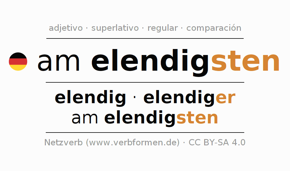El comparativo en forma de tabla con todas sus formas de declinación: fuerte, débil y mixta. Estas están representadas de forma clara en una tabla sinópica en singular, plural y en los cuatro casos gramaticales: nominativo (primer caso), genitivo (segundo caso), dativo (tercer caso) y acusativo (cuarto caso). Aquí encontraras más información acerca del tema Wiktionary am elendigsten y aquí también a través del Duden am elendigsten.