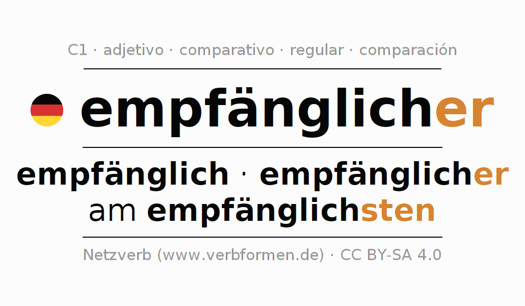 El comparativo en forma de tabla con todas sus formas de declinación: fuerte, débil y mixta. Estas están representadas de forma clara en una tabla sinópica en singular, plural y en los cuatro casos gramaticales: nominativo (primer caso), genitivo (segundo caso), dativo (tercer caso) y acusativo (cuarto caso). Aquí encontraras más información acerca del tema Wiktionary empfänglicher y aquí también a través del Duden empfänglicher.