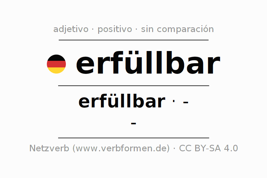 El adjetivo erfüllbar se declina (cumplible, realizable) utilizando la construcción erfüllbar, la cual no puede ser exaltada, es decir este adjetivo no permite formas del comparativo o superlativo. El adjetivo erfüllbar puede ser utilizado de forma atributiva en frente de un sustantivo así como de forma predicativa en conjunto con un verbo.Aquí puedes declinar y comparar no solamente erfüllbar sino también todos los adjetivos alemanes. Comentarios ☆