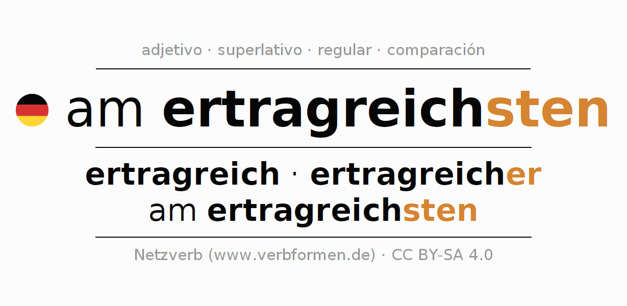 El comparativo en forma de tabla con todas sus formas de declinación: fuerte, débil y mixta. Estas están representadas de forma clara en una tabla sinópica en singular, plural y en los cuatro casos gramaticales: nominativo (primer caso), genitivo (segundo caso), dativo (tercer caso) y acusativo (cuarto caso). Aquí encontraras más información acerca del tema Wiktionary am ertragreichsten y aquí también a través del Duden am ertragreichsten.